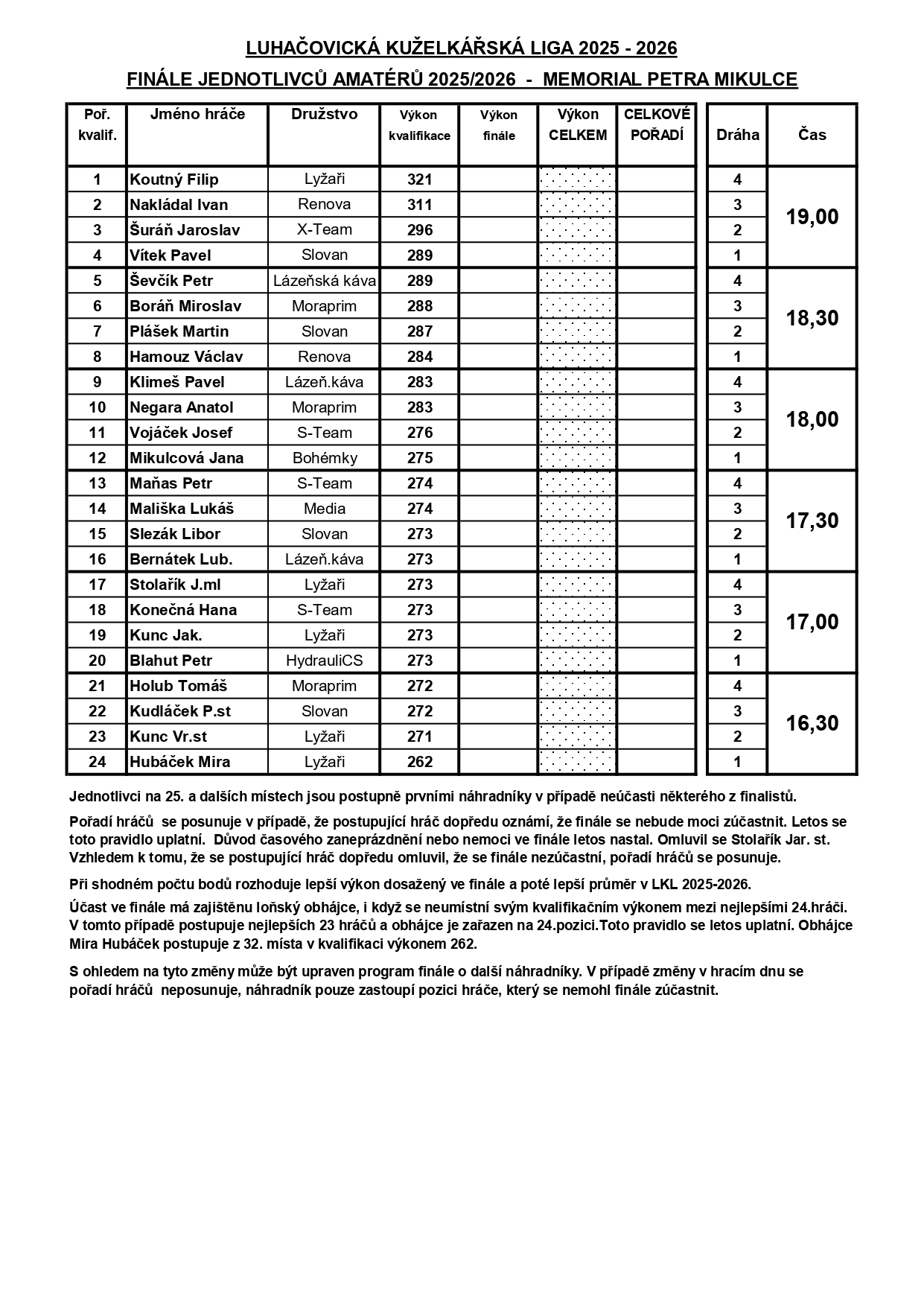 Turnaj amatérů - rozpis finále